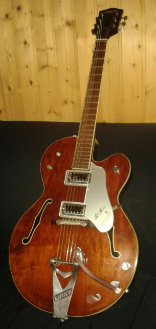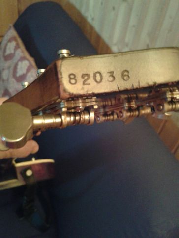 La Gretsch tiene el número de serie 82036 y esta marcado en la cabecera del clavijero, como se puede observar en la foto y, por cierto, se puede apreciar su magnífico estado de conservación a pesar de los años transcurridos. Fue fabricada en el año 1965. Fue con ella con la que grabó los 4 primeros albumes de MODULOS en Hispavox.