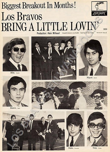 1968. Un año crucial en la historia de Los Bravos. Ávido por mantener su estela de éxito internacional, Alain Milhaud busca urgentemente un nuevo pelotazo: el resultado es “Bring a little lovin’”, un vibrante tema que la banda australiana Easybeats les cede (hasta ese momento, una maqueta no publicada). Aunque en España se convierte en un rotundo nº1, en Estados Unidos sólo es un éxito liviano (nº51 en Billboard). Cuentan que en este relativo fracaso influyó una infausta gira del grupo con caóticos episodios de Mike Kennedy; como en Turquía, donde cantó bajo un fuerte efecto de narcóticos, debiendo salir todos escoltados del local; o su inicial negativa a vacunarse para entrar en Estados Unidos…