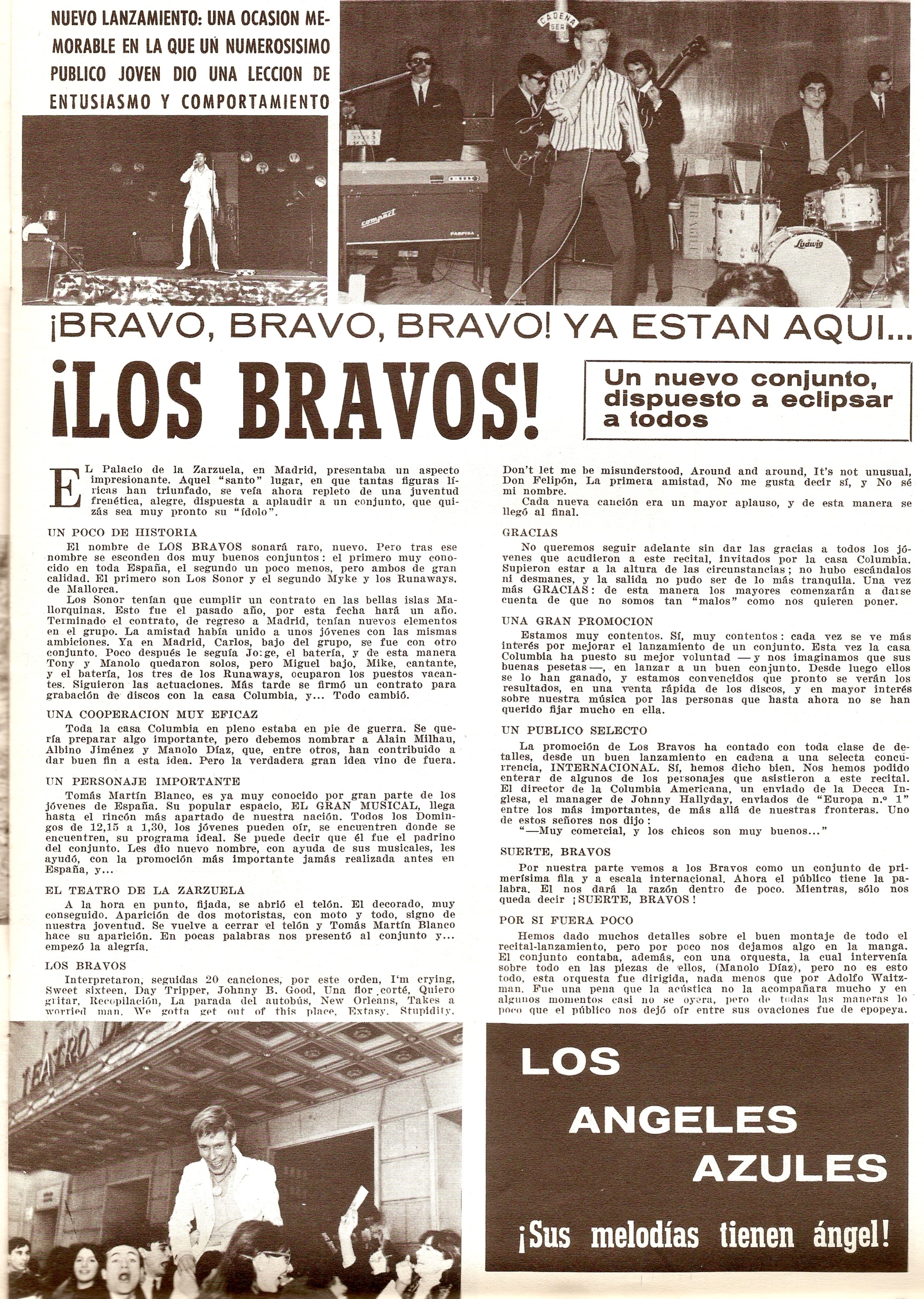 Ese año viajan a Madrid y contactan con la discográfica Columbia, tras concitar la atención del ex de Los Sonor, Manolo Díaz. En principio Díaz ve en ellos una continuación de su antigua banda, manteniendo el mismo nombre. Les presenta ante el mánager y productor de Columbia Alain Milhaud; éste, tras verlos en directo, queda impresionado por la voz y el carisma escénico de Mike (con excelente acento inglés y un timbre agudo que recordaba a Gene Pitney) y les propone firmar un contrato con su sello. A pesar de las reticencias iniciales por las estrictas condiciones del contrato, el grupo firma, rescindiendo su contrato aún vigente con Philips. Por breve tiempo cambian su nombre por el de Los Nuevos Sonor, pero pronto todos coinciden en que es un proyecto distinto; buscan un nombre definitivo, y para ello organizan un concurso de ideas. Manolo Díaz, no obstante, propone el nombre de Los Bravos -palabra española internacionalmente reconocible y usada en muchas lenguas-. Todos lo aprueban de inmediato. De igual modo, su cantante, Michael Kogel, se convertirá en Mike Kennedy. Por su parte, Manolo Díaz se encargará de escribirles temas. Hasta la fecha, sus actuaciones se centran sobre todo en la discoteca Haima, donde nacieron como grupo. “Nos pagaban 5.000 pesetas por actuación”, recuerda Miguel Vicens, “pero conforme iba subiendo en las listas nuestro disco, aumentaban 500 pesetas el salario”.